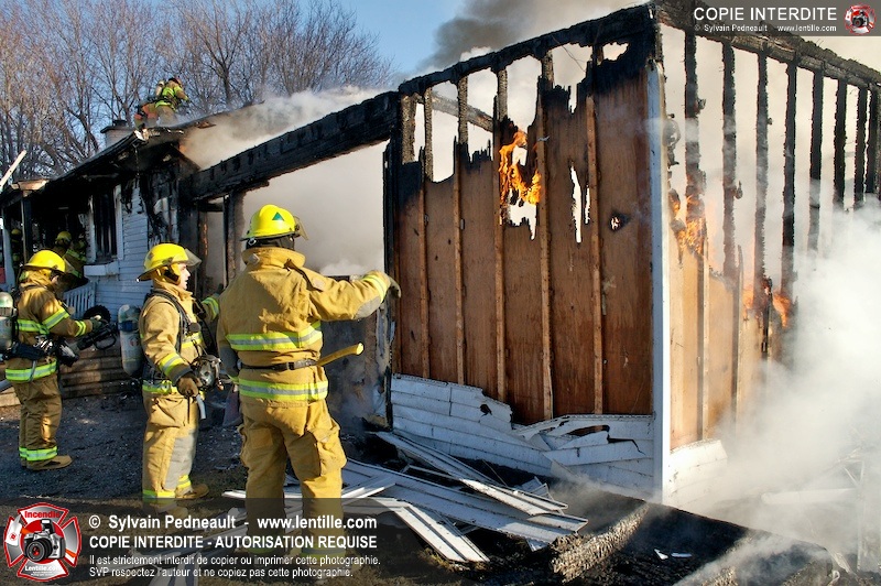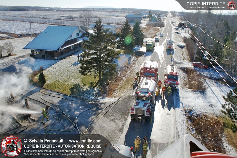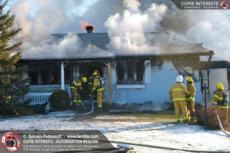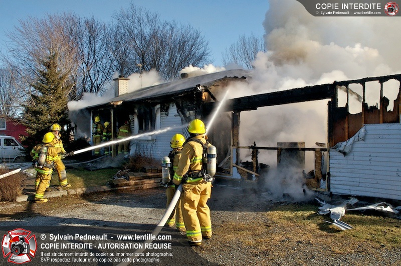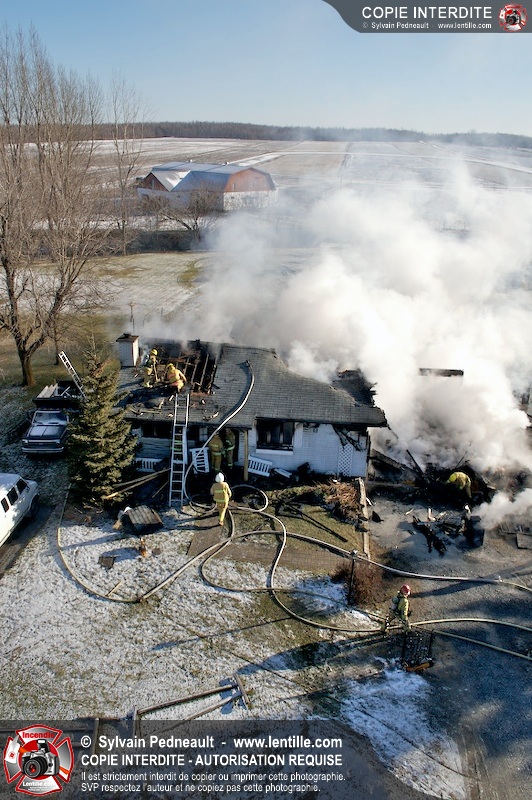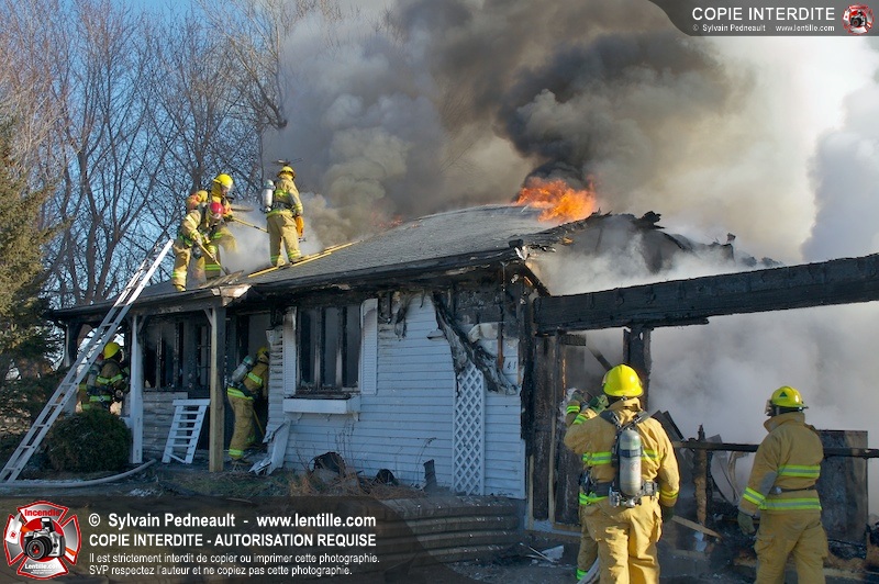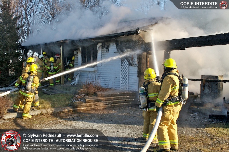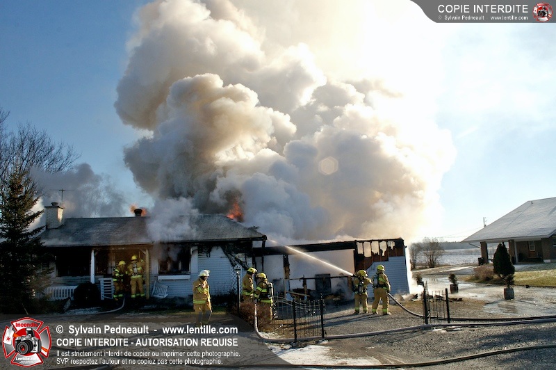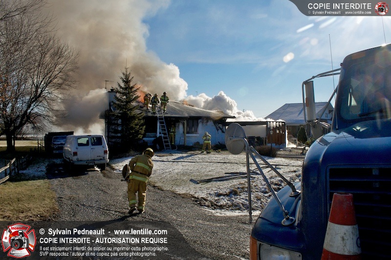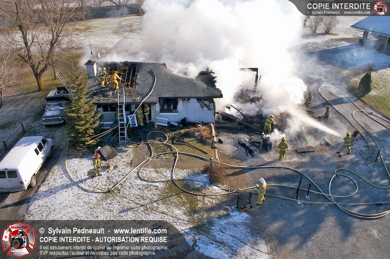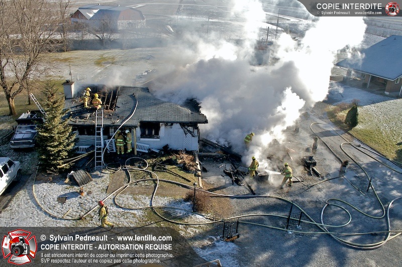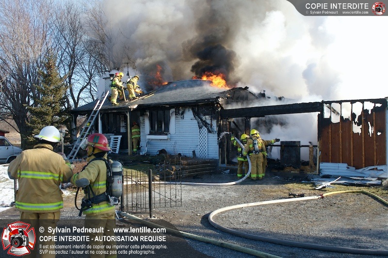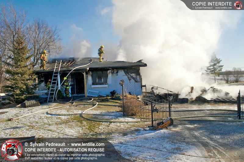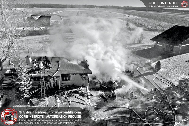 Une résidence du 5e rang est partie en fumée alors que ses propriétaires étaient absents. Les pompiers ont sonné une deuxième alarme pour disposer des secours nécessaires aux opérations. À un certain moment, un retrait stratégique a été ordonné par le chef aux opérations, mais une unité a été redéployée au secteur 1 peu après.